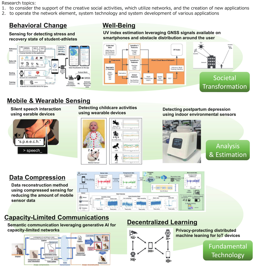Well-being refers to a state of not only physical health but also mental and social fulfillment. Our lab focuses on developing systems that enhance daily life by utilizing sensor data from users and their surrounding environments, gathered through smartphones, wearable devices, and other tools. We also study methods to promote behavioral change that supports well-being.