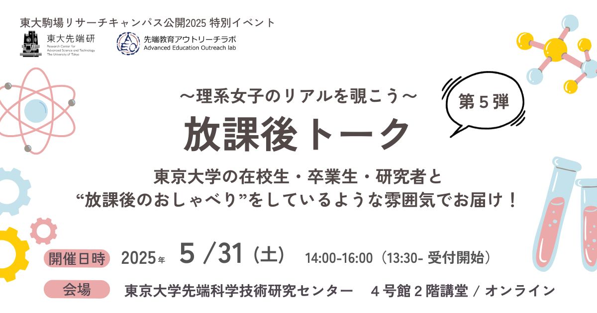 毎回好評の、理系の魅力とリアルをお届けする、東大先端研AEO「放課後トーク」第5弾。前半では、学部生から社会人まで多様なメンバーが、文理選択からキャリアまで自身の経験を紹介します。後半では、グループに分かれて、他校の生徒と交流しながら、年齢も専攻もばらばらなメンバーに直接様々な質問ができます。進路選択のヒントを得られる貴重な機会です!